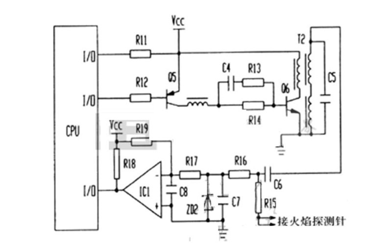 Short needle and the body, T1 secondary winding 150V AC pulse voltage through R15 and C7 form a loop, because of the linearity of the AC circuit capacitor, IC1 comparator's negative terminal of the action of the R19 potential higher than the positive terminal, the comparator inverts the output low, this low-level signal is input to the MCU port on the flame signal is detected, so that the microcontroller through the flame signal detection level of the input level can determine the presence or absence of flame.